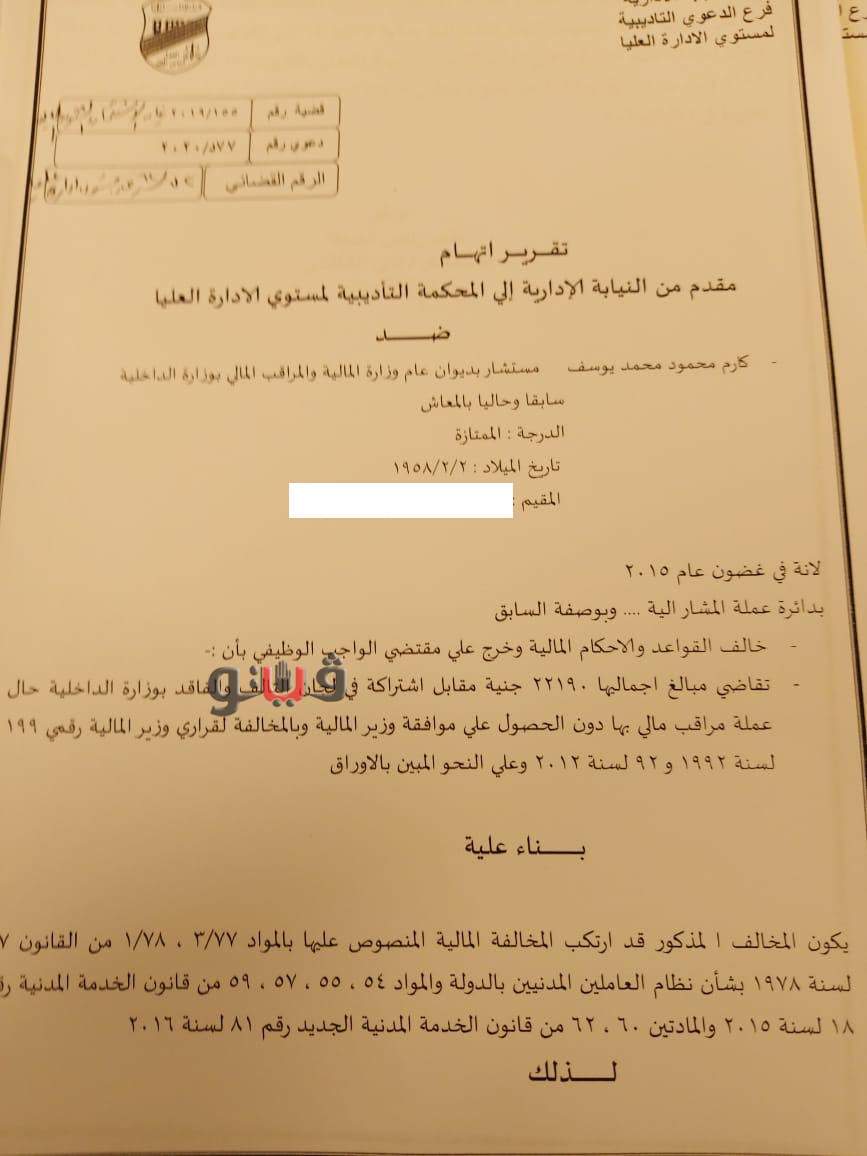 إحالة مستشار بـ"المالية" للمحاكمة لتقاضيه أموالا من "الداخلية" (مستند)