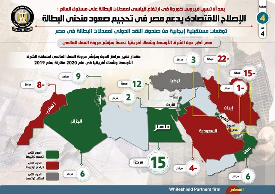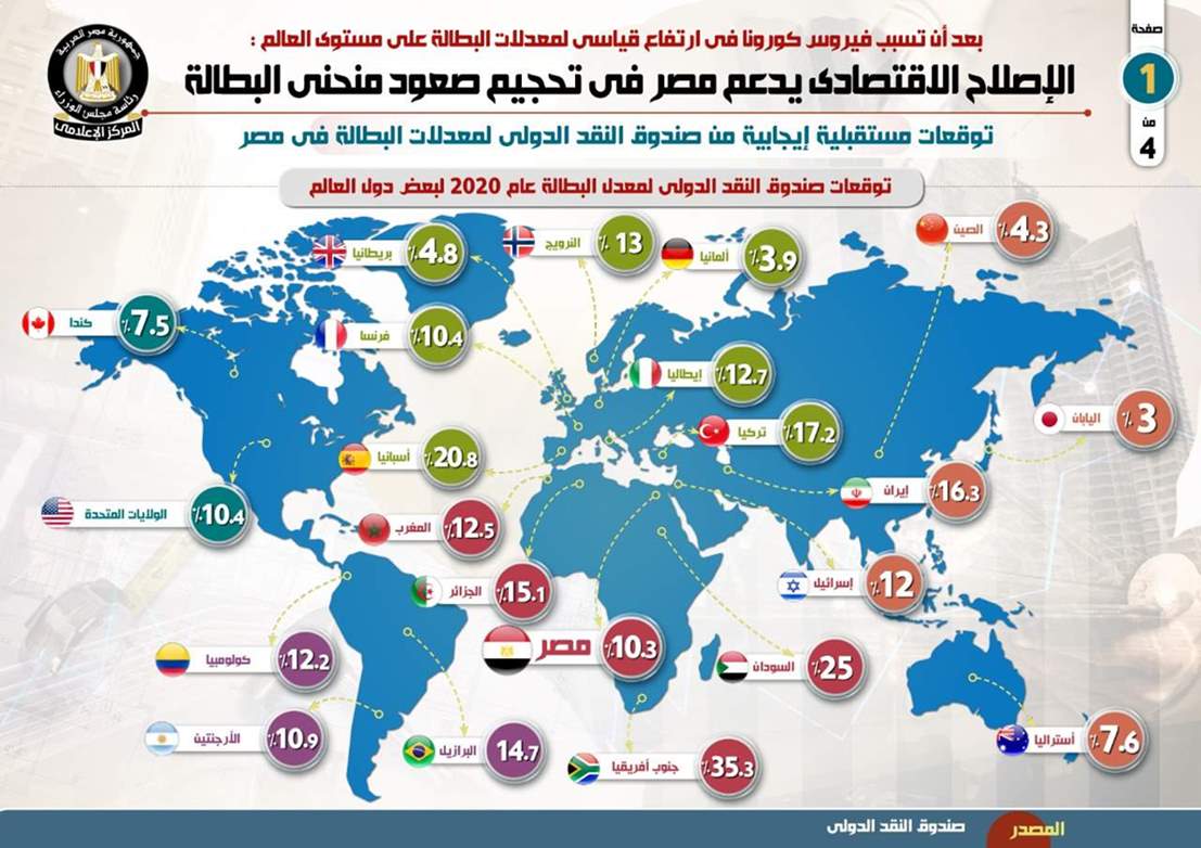 ونشر المركز الإعلامي لمجلس الوزراء، تقريراً شمل إنفوجرافات تسلط الضوء على قدرة الإصلاح الاقتصادي على دعم مصر في تحجيم صعود منحنى البطالة مصحوباً بتوقعات مستقبلية إيجابية من صندوق النقد الدولي، وذلك بعد أن تسبب فيروس كورونا في ارتفاع قياسي لمعدلات البطالة على مستوى العالم.