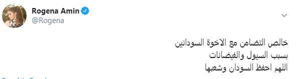 وكتبت روجينا تغريدة على تويتر قالت فيها: "خالص التضامن مع الاخوة السودانيين بسبب السيول والفيضانات اللهم احفظ السودان وشعبها".