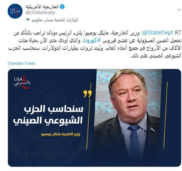 وكتبت الخارجية الأمريكية على لسان وزيرها مايكل بومبيو: "يلتزم الرئيس دونالد ترامب بالتأكد من تحميل الصين المسؤولية عن تفشي فيروس #كورونا، والذي أودى حتى الآن بحياة مئات الآلاف من الأرواح في جميع أنحاء العالم، ويُبدد ثروات بمليارات الدولارات. سنحاسب الحزب الشيوعي الصيني على ذلك"