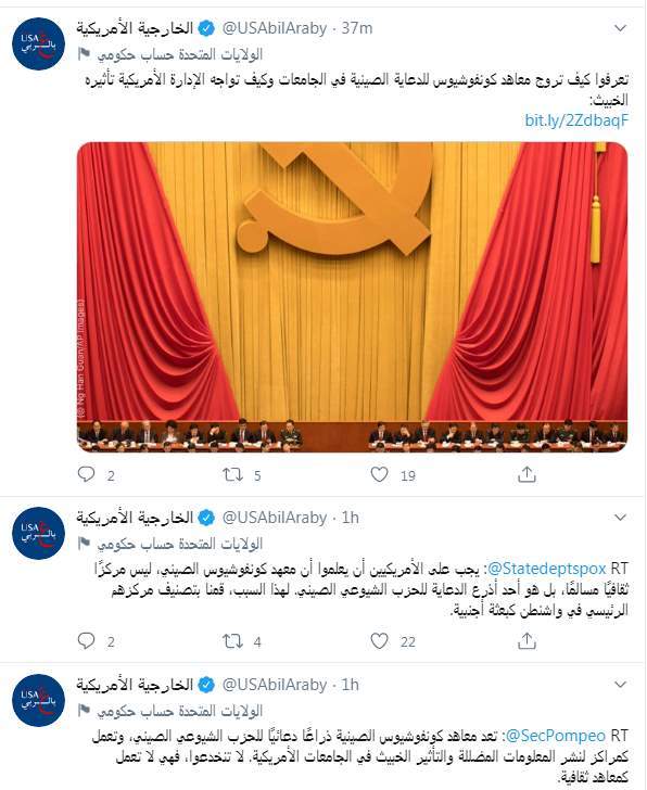 وعلي صعيدٍ متصل قالت الخارجية الأمريكية "تعد معاهد كونفوشيوس الصينية ذراعًا دعائيًا للحزب الشيوعي الصيني، وتعمل كمراكز لنشر المعلومات المضللة والتأثير الخبيث في الجامعات الأمريكية. لا تنخدعوا، فهي لا تعمل كمعاهد ثقافية"