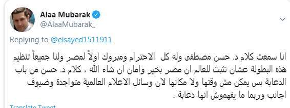 وكتب علاء مبارك تغريدة على تويتر قال فيها: "انا سمعت كلام الدكتور حسن مصطفى وله كل الاحترام ومبروك اولاً لمصر ولنا جميعاً تنظيم هذه البطولة عشان نثبت للعالم ان مصر بخير وامان ان شاء الله، كلام الدكتور حسن من باب الدعابة بس يمكن مش وقتها ولا مكانها لان وسائل الاعلام العالمية متواجدة وضيوف أجانب وربما ما يفهموش انها دعابة".
