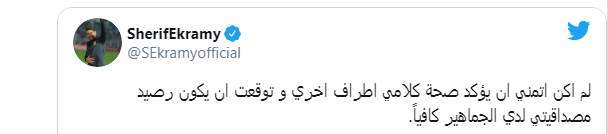 وكتب شريف إكرامي عبر حسابه الشخصي على تويتر : " لم أكن أتمنى أن يؤكد صحة كلامي أطراف أخرى وتوقعت أن يكون رصيد مصداقيتي لدى الجماهير كافيًا.