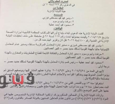 أصدرت المحكمة التأديبية العليا بمجلس الدولة حكمها ببراءة 3 مسئولين من قيادات الهيئة القومية لسكك حديد مصر بعد ثبوت عدم إرتكابهم مخالفات مالية وإدارية جسيمة ترتب عليها إهدار 1.7 مليون جنيه