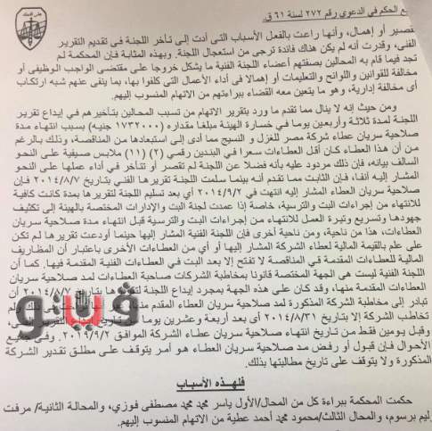 وجاء بأسباب الحكم عدم صحة ما كشفت عنه التحقيقات بأن المحالين الثلاثة إستغرقوا مدة 43 يومًا للفحص الفني بالمخالفة لتوصيات لجنة البت بعدم تجاوز مدة 15 يومًا مما ترتب عليه تحميل الهيئة جهة عملهم مبلغ مليون و 732 الف جنيه، وأنتهت المحكمة التأديبية العليا إلى براءتهم