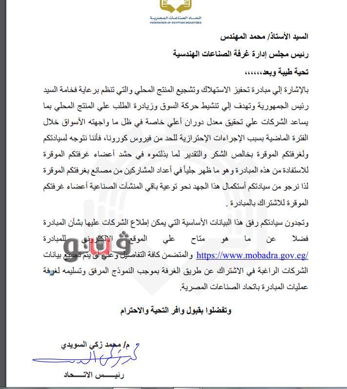 وأوضح الخطاب ان الموقع الاليكترونى للمبادرة www.mobadra.gov.eg يتضمن كافة التفاصيل المتعلقة بالمبادرة، على ان يتم تجميع بيانات الشركات الراغبة فى الاشتراك عن طريق الغرفة بموجب بموجب النموذج المرفق وتسليمه لغرفة عمليات المبادرة باتحاد الصناعات.