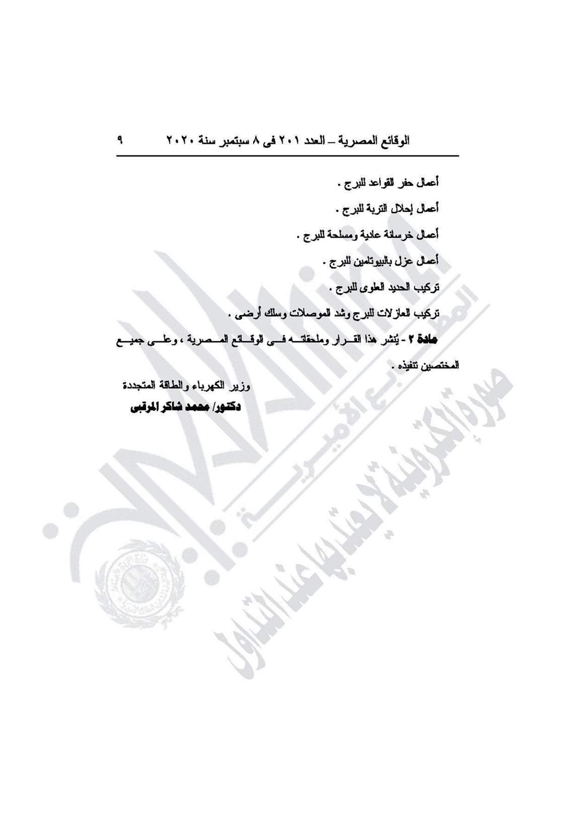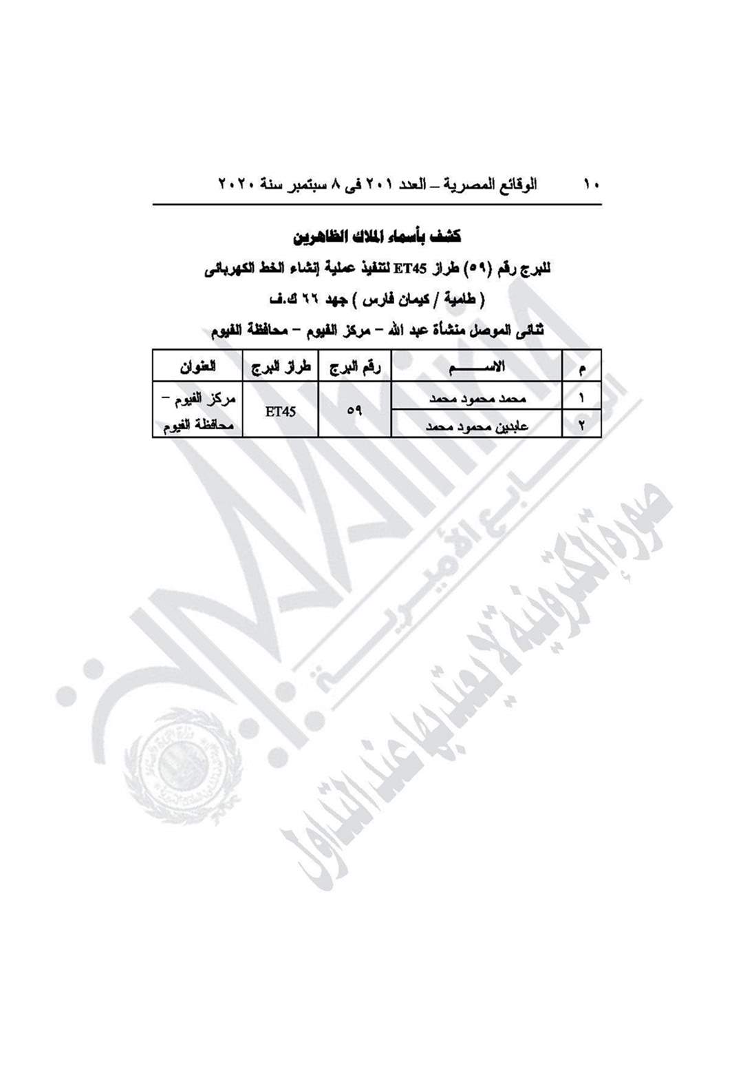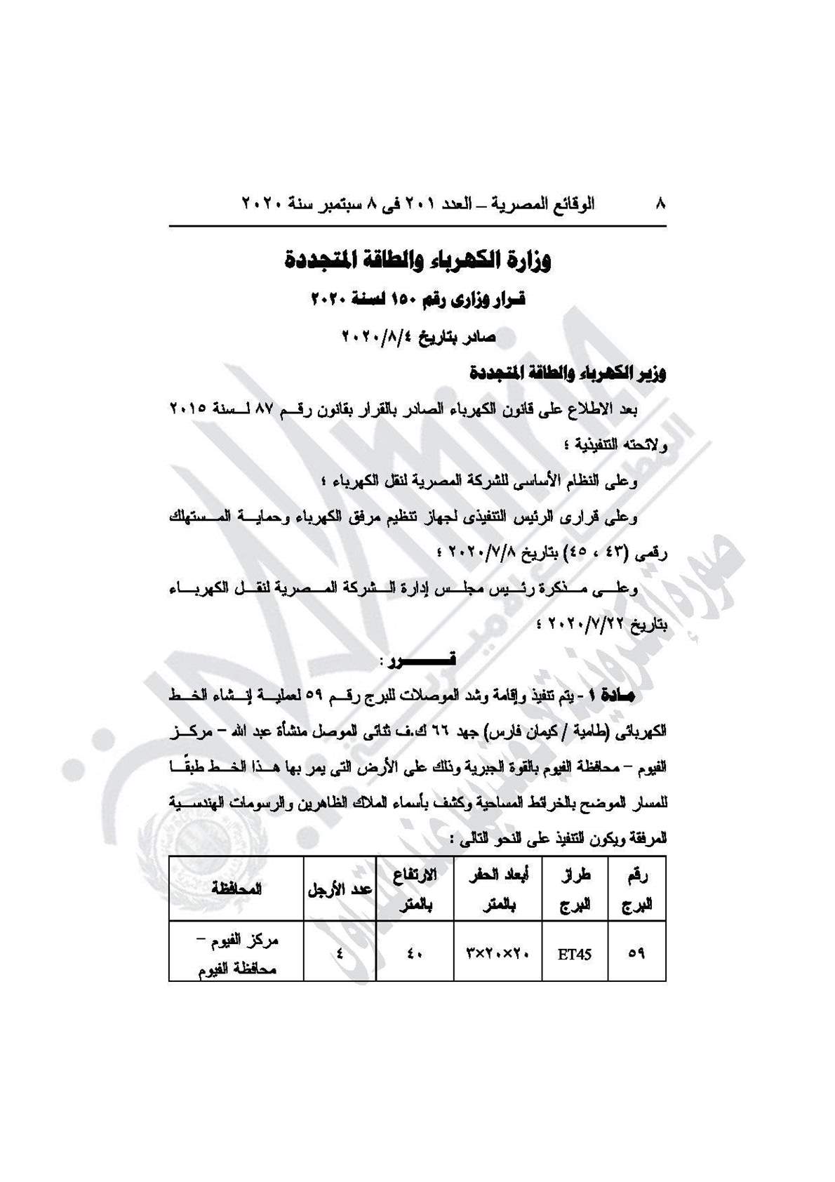 نشرت جريدة الوقائع المصرية في عددها رقم 201، الصادر في 8 سبتمبر 2020، قرار وزارة الكهرباء والطاقة المتجددة رقم 150 لسنة 2020، بشأن تنفيذ وإقامة وشد الموصلات للبرج رقم 59 لعملية إنشاء خط الكهرباء طامية/ كيمان فارس بالفيوم.