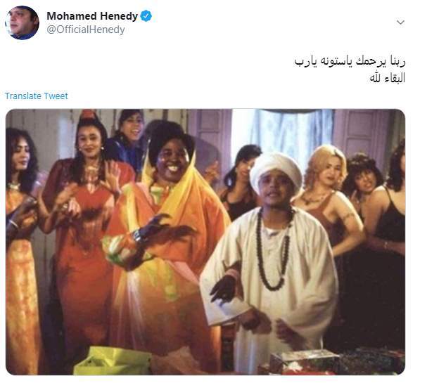 وكتب محمد هنيدي تغريدة على "تويتر": "ربنا يرحمك ياستونة يارب.. البقاء لله"، ناشرا صورة من مشهد ظرت فيه معه في فيلم "صعيدي في الجامعة الأمريكية".