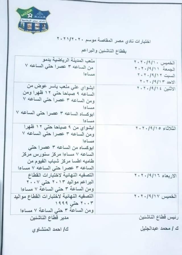 أعلن نادي مصر المقاصة أحد أندية الدوري الممتاز ، إجراء إختبارات الناشئين 2020 -2021 بنادي مصر المقاصة، بداية من مواليد عام 1999وحتى ٢٠١٣.