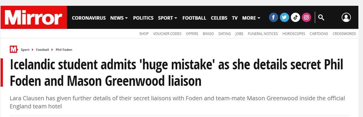 كشفت لارا كلاوسن الطالبة الإيسلندية والتي تبلغ من العمر 19 عاما، تفاصيل علاقاتها السرية مع فيل فودين ومايسون جرينوود، نجما منتخب إنجلترا بعد أن تم استبعادهما من تشكيلة المنتخب الإنجليزي أمام الدنمارك بسبب الفيديو الإباحي الذي نشرته معهما خلال تواجدها بغرفة الفندق الخاصة بهم في آيسلندا.