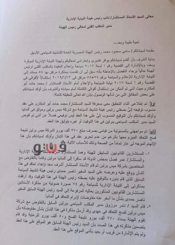 1- المستشارين القانونيين السابقين للهيئة وهما المستشار أشرف سعد بالنيابة الإدارية والمستشار عمر فضل، بمجلس الدولة قد سافرا إلى ألمانيا مرتين وقاما بالتفاوض مع المختصين بشركة ميس برلين ثم قام المستشار أشرف سعد بإعداد تعاقد فى هذا الشأن ووقع عليه وعرضه على السفير ناصر حمدي، رئيس هيئة تنشيط السياحة السابق الذي قام بدوره بالتوقيع عليه بصفته رئيس الهيئة حينذاك، وقد أرفقت بمذكرتي إلى النيابة الإدارية للسياحة المقيدة برقم 74 صورة ضوئية من مذكرة المستشارين القانونيين المذكورين بعاليه المرفوعة إلى رئيس الهيئة السابق السفير ناصر حمدى بشأن ما أسفر عنه مفاوضات لإبرام التعاقد فى ألمانيا