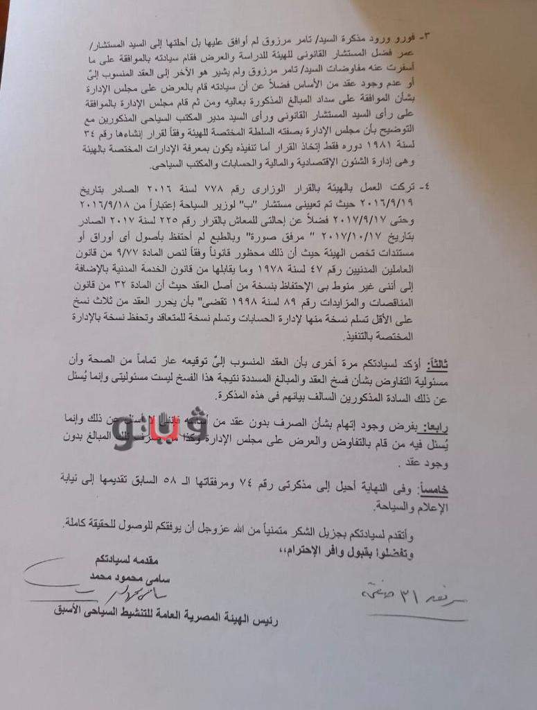 3- فورو ورود مذكرة تامر مرزوق لم أوافق عليها بل أحلتها إلى المستشار عمر فضل المستشار القانوني للهيئة للدراسة والعرض فقام بالموافقة على ما أسفرت عنه مفاوضات تامر مرزوق ولم يشير هو الآخر إلى العقد المنسوب لي أو عدم وجود عقد من الأساس فضلاً عن أنه قام بالعرض على مجلس الإدارة بشأن الموافقة على سداد المبالغ المذكورة بعاليه، ومن ثم قام مجلس الإدارة بالموافقة على رأي المستشار القانونى ورأى تامر مرزوق مدير المكتب السياحي، مع التوضيح بأن مجلس الإدارة بصفته السلطة المختصة للهيئة وفقًا لقرار إنشاءها رقم 34 لسنة 1981 دوره فقط إتخاذ القرار، أما تنفيذه يكون بمعرفة الإدارات المختصة بالهيئة وهي إدارة الشئون الإقتصادية والمالية والحسابات والمكتب السياحي