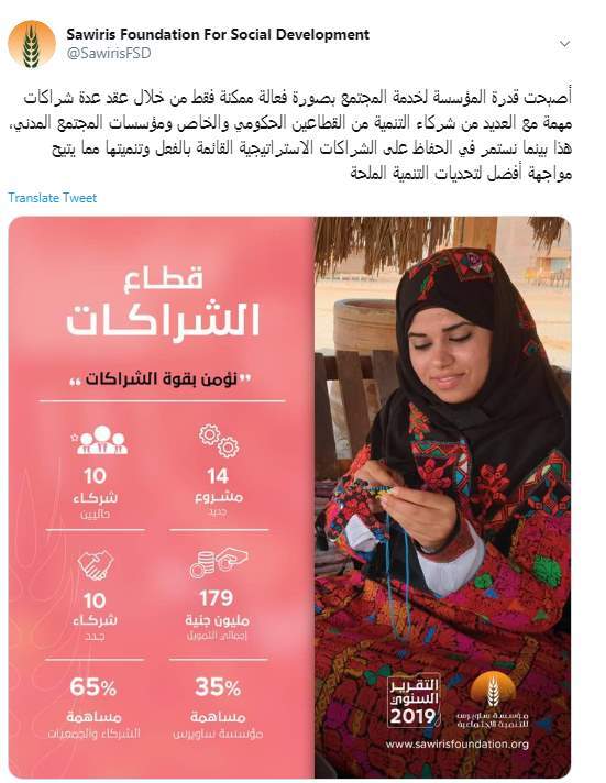 وكتبت مؤسسة ساويرس للتنمية الاجتماعية تغريدة على تويتر قالت فيها: "أصبحت قدرة المؤسسة لخدمة المجتمع بصورة فعالة ممكنة فقط من خلال عقد عدة شراكات مهمة مع العديد من شركاء التنمية من القطاعين الحكومي والخاص ومؤسسات المجتمع المدني، بينما نستمر في الحفاظ على الشراكات الاستراتيجية القائمة بالفعل وتنميتها مما يتيح مواجهة أفضل لتحديات التنمية الملحة".