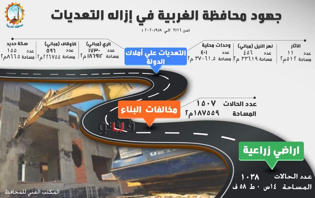 وأشار محافظ الغربية الى أنه تم إزالة 1038 مخالفه تعدي علي الأراضي الزراعية بمساحة 55 فدان و . قيراط و 14 أسهم ، زالةلة 1507 مخالفة بناء بمساحة 187 ألف و 559 مِتْرًا . بالإضافة إلى إزالة 3349 تعديًا على أراضي أملاك الدولة بمساحة 493 ألف و 524 متر مربع.