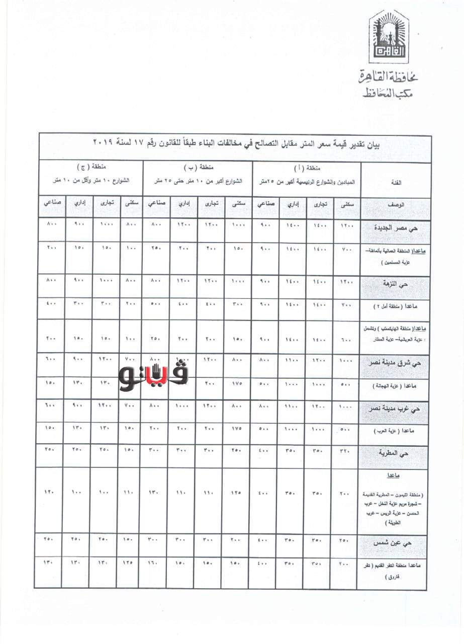 أعلن إبراهيم صابر، نائب محافظ القاهرة للمنطقة الشرقية، جدول تعديل أسعار التصالح علي مخالفات البناء في أحياء المنطقة الشرقية وتشمل أحياء : ( مصر الجديدة - النزهة - شرق مدينة نصر - غرب مدينة نصر - المطرية - عين شمس - السلام أول - السلام ثان - المرج)