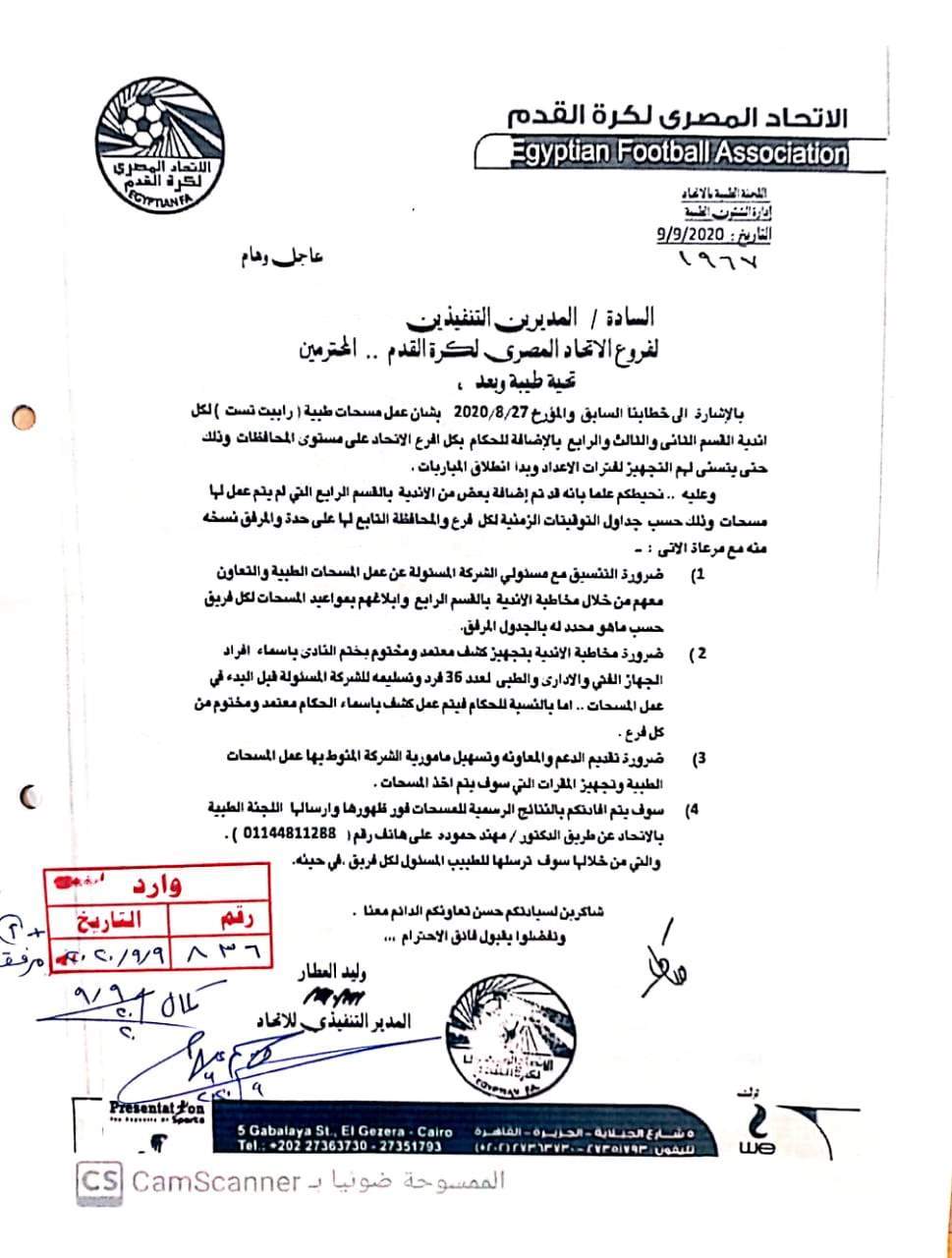وأكد اتحاد الكرة علي إعداد كشف بـ 36 فردا مختوم من النادي يشمل اللاعبين والجهاز لأخذ تلك العينات وأكدت الجبلاية أنه سيتم إخطار طبيب كل فريق من قبل اللجنة الطبية بالجبلاية بنتائج العينات.