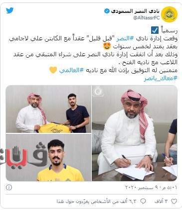 وقال النصر عبر حسابه الرسمي على ”تويتر“، يوم الأربعاء: ”وقعت إدارة نادي النصر عقداً مع الكابتن علي لاجامي بعقد يمتد لخمس سنوات، وذلك بعد أن اتفقت إدارة نادي النصر على شراء المتبقي من عقد اللاعب مع ناديه الفتح، متمنين له التوفيق بإذن الله مع ناديه“.