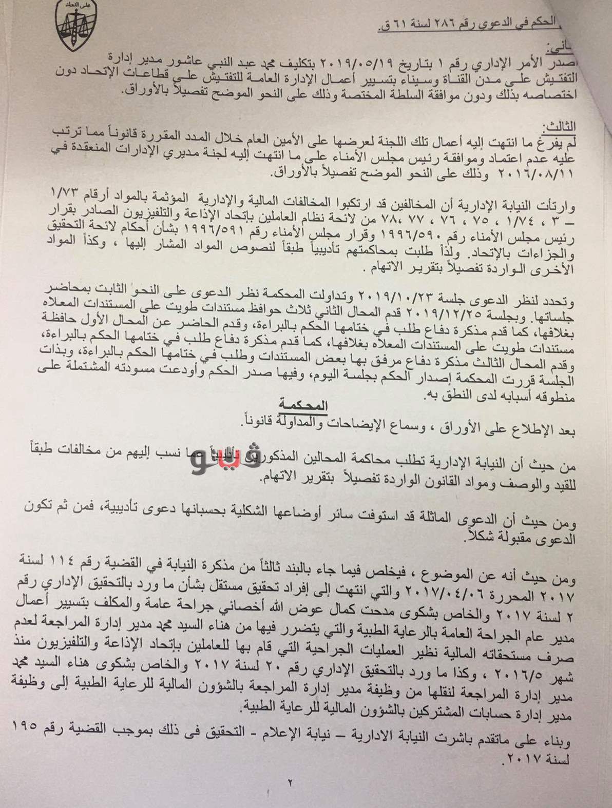 العاملين في ماسبيرو خلال عامي 2015 و 2016، وبراءة مدير عام لعدم صحة ارتكابه