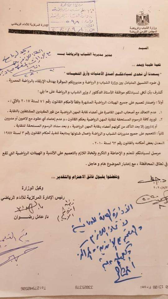 أخطرت وزارة الشباب والرياضة ، المديريات التابعة للوزارة بالمحافظات باشتراط الحصول علي عضوية ودفع الاشتراكات لنقابة المهن الرياضية قبل تفعيل عقود اللاعبين وعمل المدربين والإداريين.