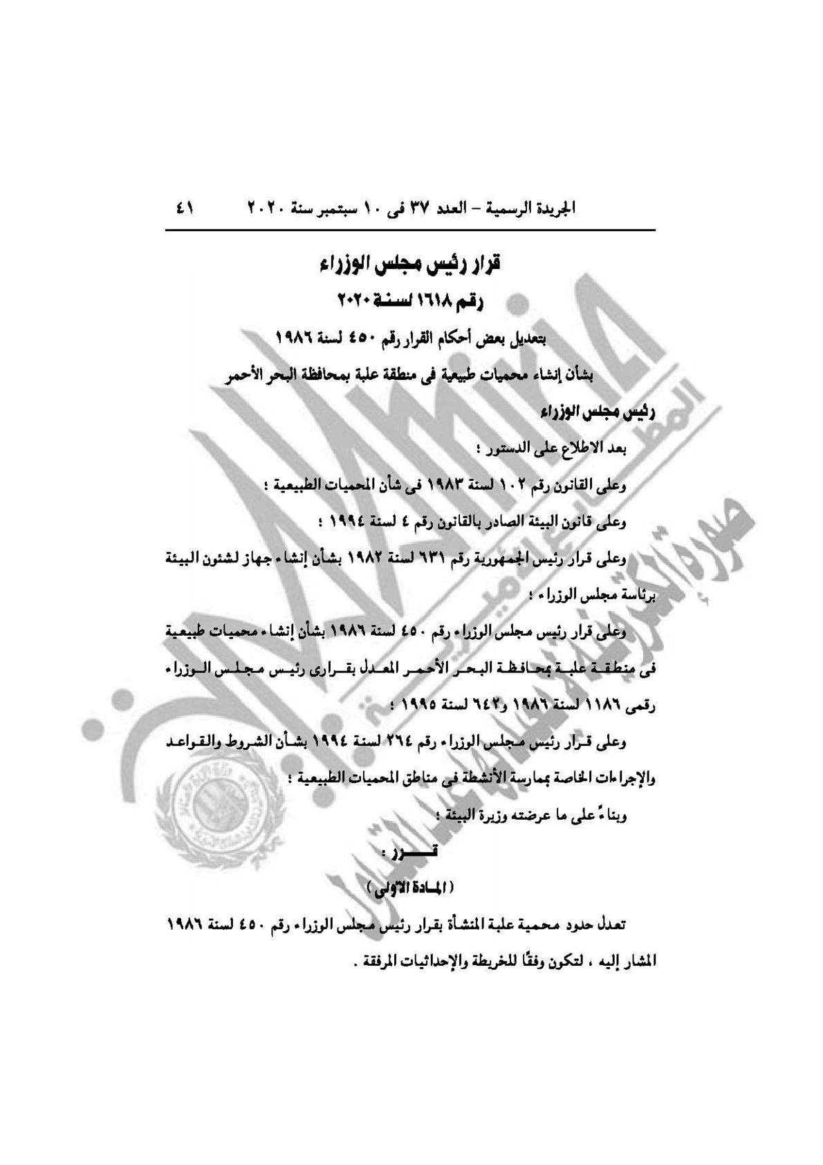 وحمل القرار الاول رقم 1618 لسنة 2020، بتعديل بعض أحكام القرار رقم 450 لسنة 1986 بشأن إنشاء محميات طبيعية في منطقة علبة بمحافظة البحر الأحمر.