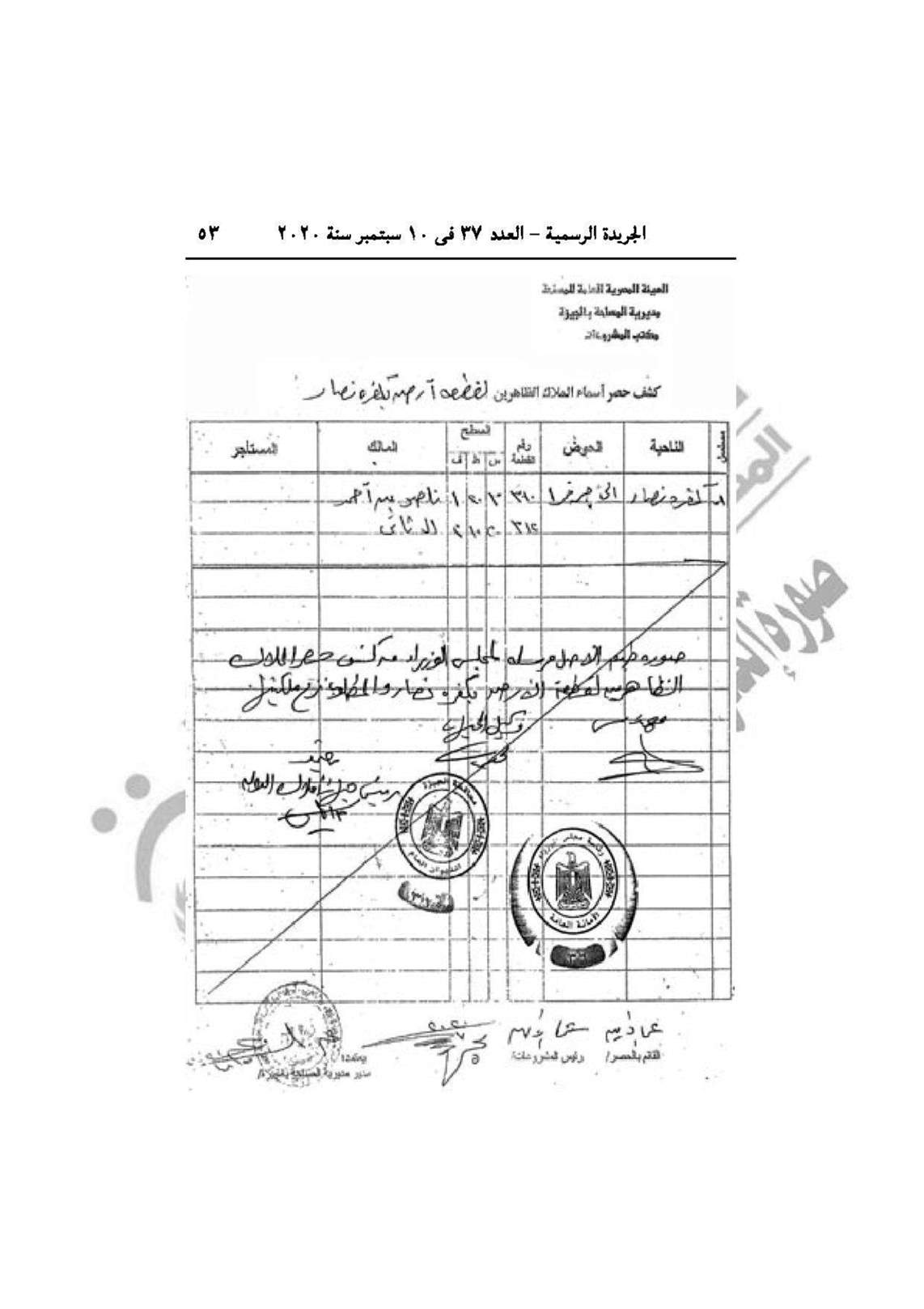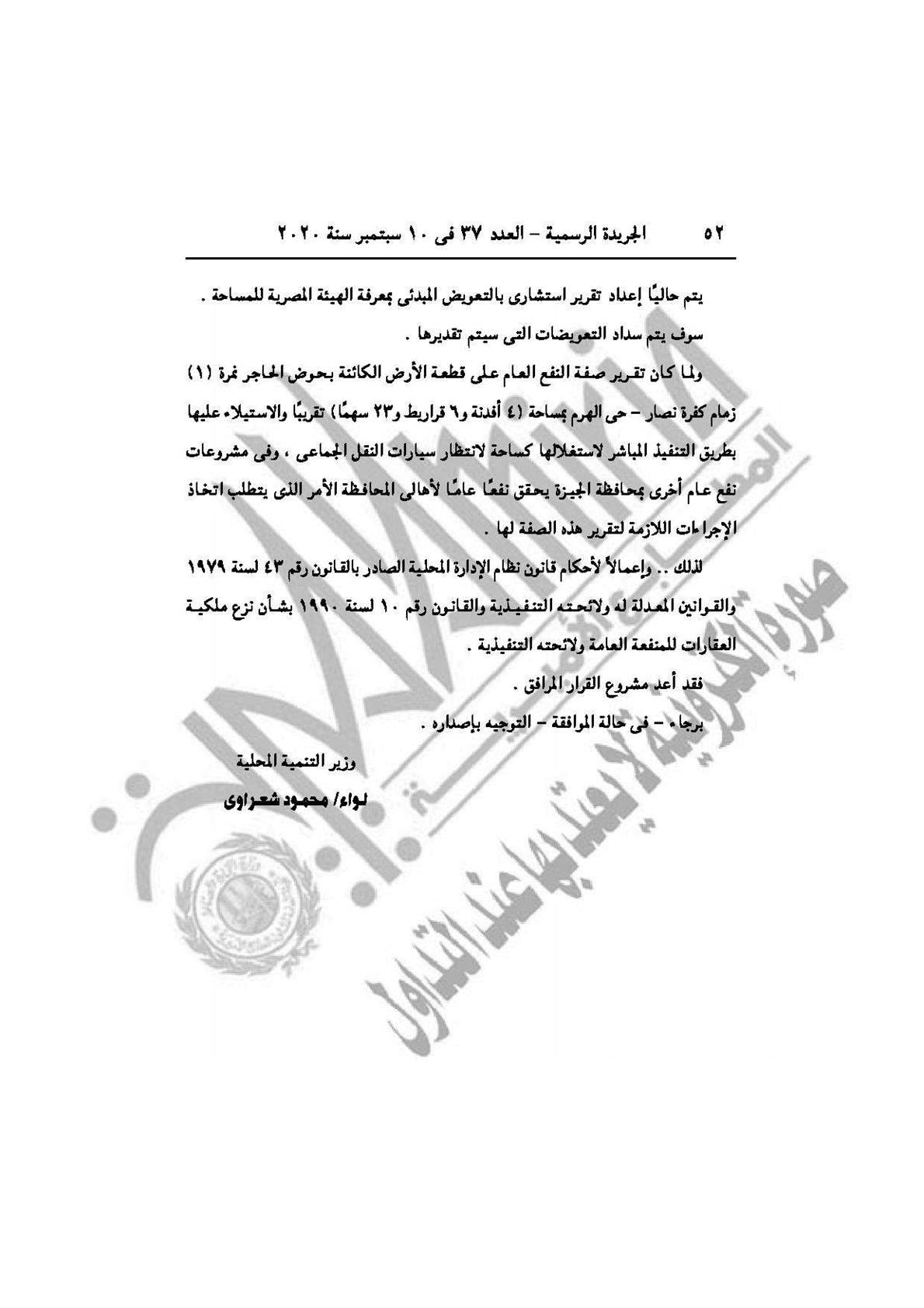 وحمل القرار الثاني رقم 1619 لسنة 2020، باعتبار مشروع إقامة ساحة انتظار سيارات النقل الجماعي، الواقعة بحوض الحاجر نمرة (1) زمام كفر نصار بشارع ترعة المنصورية نهاية شارع فيصل حي الهرم بمحافظة الجيزة من أعمال المنفعة العامة.