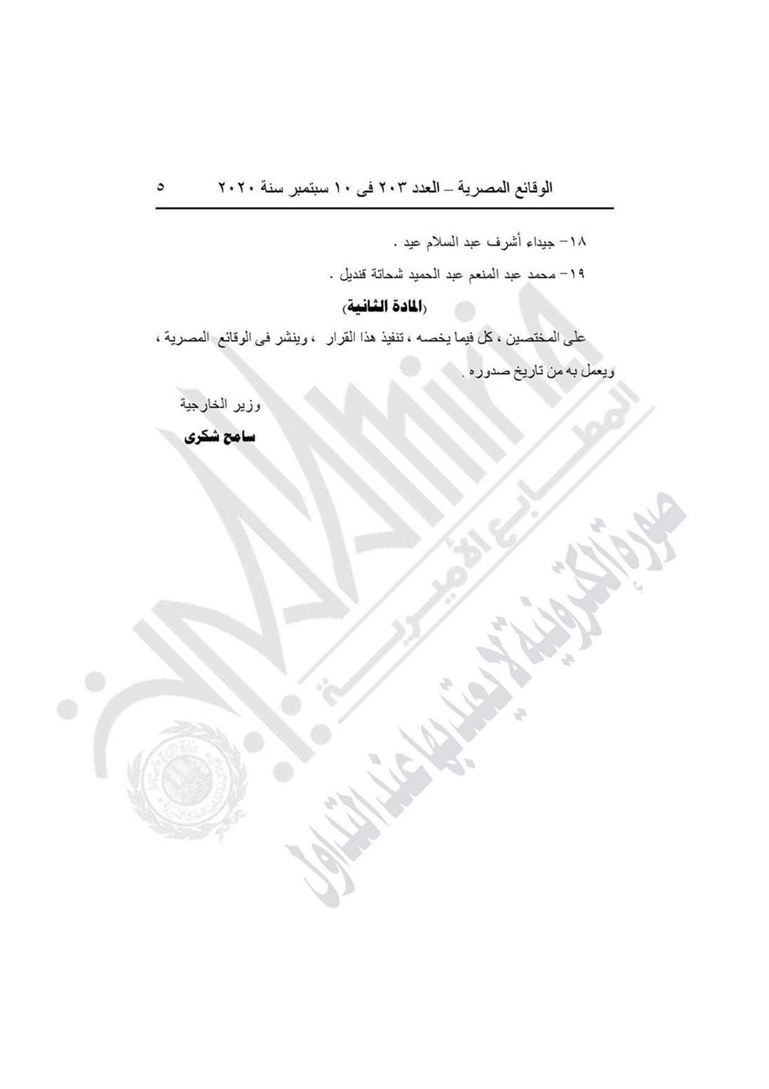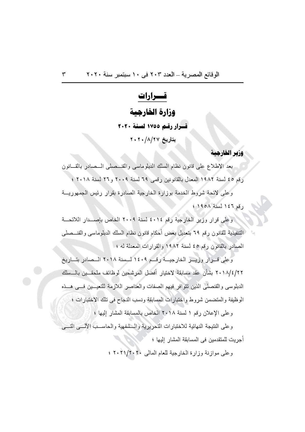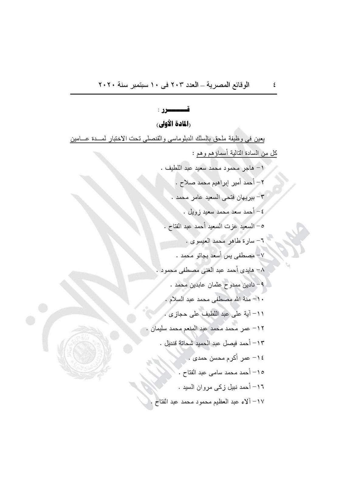 نشرت جريدة الوقائع المصرية في عددها رقم 203، الصادر في 10 سبتمبر 2020، قرار وزارة الخارجية رقم 1755 لسنة 2020، بشأن تعيين 19 ملحقا بالسلك الدبلوماسي والقنصلي تحت الاختبار لمدة عامين.