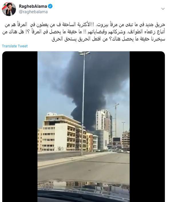 حريق جديد في ما تبقى من مرفأ بيروت. !!الأكثرية الساحقة ف من يعملون في المرفأ هم من أتباع زعماء الطوائف. وشركائهم وقبضاياتهم !! ما حقيقة ما يحصل في المرفأ ؟! هل هناك من سيخبرنا حقيقة ما يحصل هناك؟ من افتعل الحريق يستحق الحرق pic.twitter.com/Yt36cZPLSw— RaghebAlama (@raghebalama) September 10, 2020