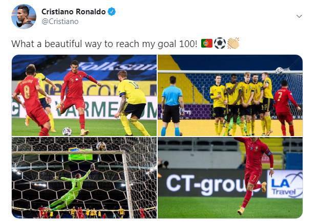 وكتب كريستيانو رونالدو تغريدة على "تويتر": "يالها من طريقة جميلة لأن أصل لهدفي الـ100".
