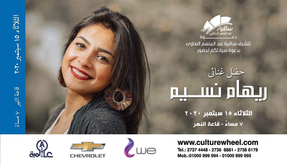 تنظم ساقية الصاوي ، يوم الثلاثاء الموافق 15 سبتمبر الجاري، في تمام السابعة مساءً، حفلاً غنائياً للمطربة الشابة ريهام نسيم ، على مسرح النهر.