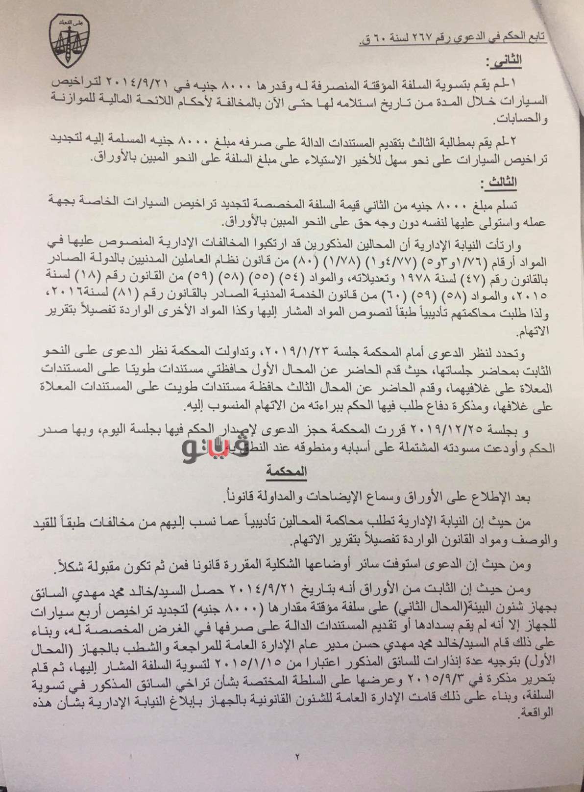 المخالف الثاني خالد أبو بكر أحمد، السائق بالجهاز بتسوية مبلغ السلفة المنصرفة إليه.
