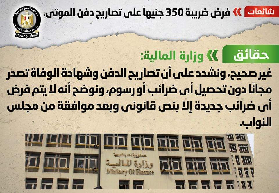 وأضافت وزارة المالية أن تصاريح الدفن وشهادة الوفاة تصدر مجانًا دون تحصيل أي ضرائب أو رسوم، مُوضحةً أنه لا يتم فرض أي ضرائب جديدة إلا بنص قانوني وبعد موافقة من مجلس النواب.