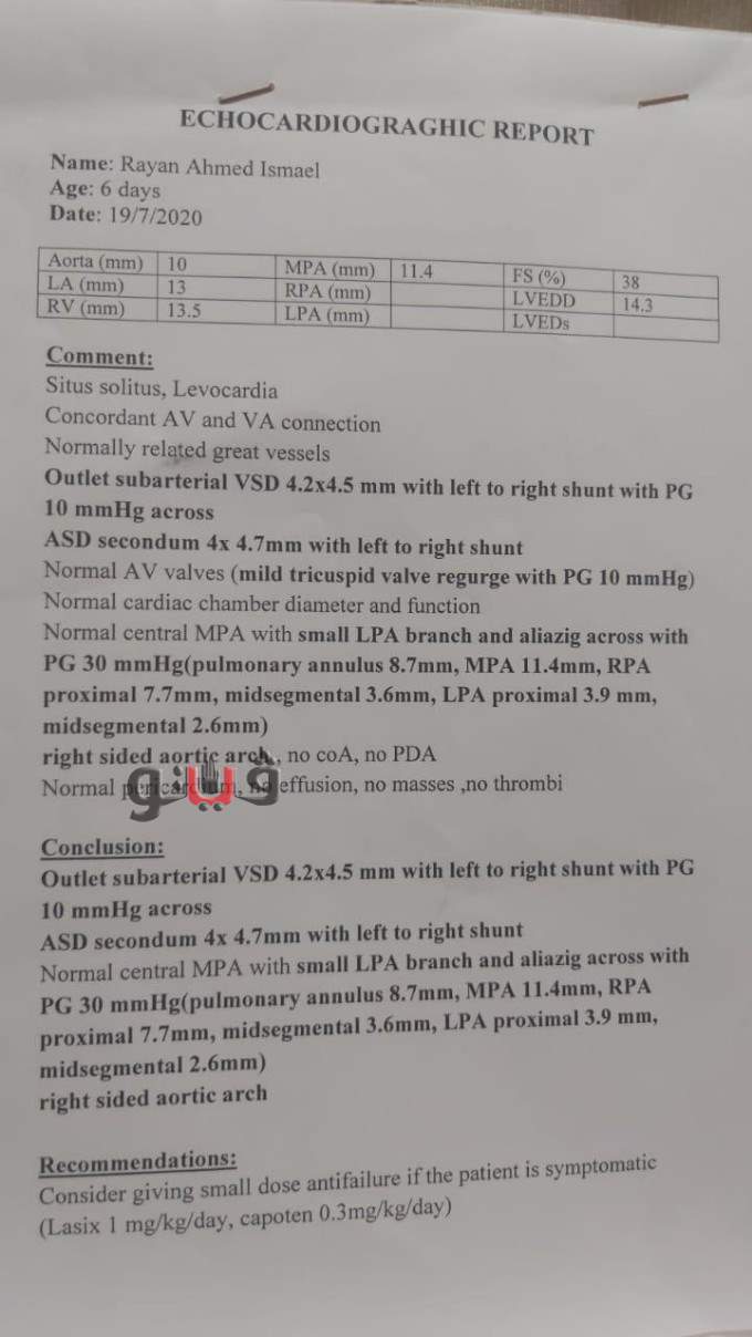 وأضاف والد الرضيع، تزوجت قبل ١٠ سنوات ونعيش فى قرية فرسيس مركز زفتي بمحافظة الغربية، واعمل سباك صحي حر، والعمل غير منتظم والدخل غير ثابت، وريان هو طفلي الثاني بعد إسماعيل وعمره ٦ سنوات، والطفلان عن طريق الحقن المجهري، وعقب ولادته وبالتحديد بعد يوم من الولادة سمعنا صوت غريب في صدره، وتوجهنا لطبيبة متخصصة في القلب والتي بدورها طلبت أشعة "الايكو" والتي اثبتت اصابته بضيق وانعكاس بشرايين القلب وبثقبين بالقلب احدهما بين الاذينين والآخر بين البطينين ولابد من تدخل جراحي وأوصت بعرضه علي اطباء استشاريين في جراحة القلب والذين أوصوا بنقله إلى مركز مجدى يعقوب للقلب بمدينة أسوان او مستشفي ابو الريش او اي مركز كبير لجراحات القلب للاطفال، وماديًا لا استطيع إلا المراكز الحكومية المجانية.