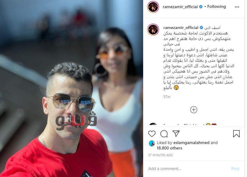 وغازل الفنان رامز أمير حبيبته من خلال تعليقه على الصورة التي نشرها، بعد إخفاء ملامحها وعلق على الصورة قائلا:"اسف انى هستخدم الاكونت لحاجة شخصية يمكن متهمكوش، بس دى حاجة هتفرح اهم حد فى حياتى".