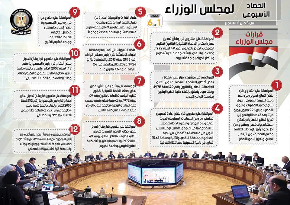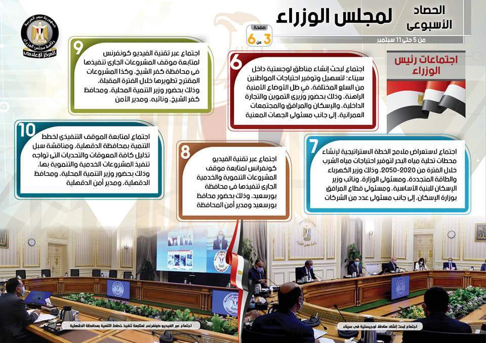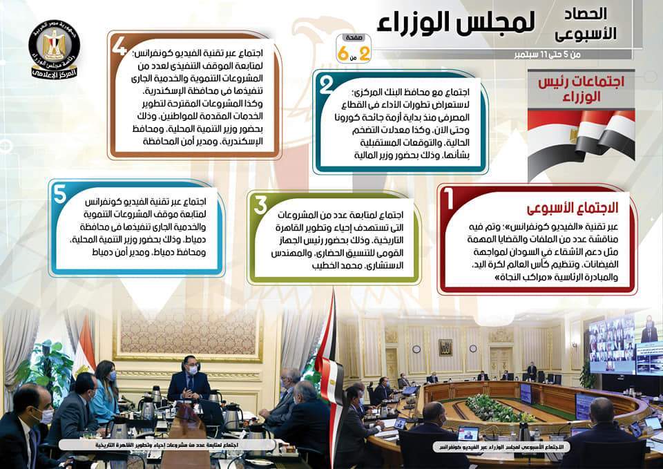 نشر المركز الإعلامي لمجلس الوزراء، تقريراً شمل إنفوجرافات سلط من خلالها الضوء على الحصاد الأسبوعي لمجلس الوزراء، وذلك خلال الفترة من 5 حتى 11 سبتمبر 2020، والذي تضمن الموافقة على عدد من القرارات، فضلاً عن الاجتماعات واللقاءات التي عقدها الدكتور مصطفى مدبولي، رئيس مجلس الوزراء، بالإضافة إلى ما قام به من أنشطة.