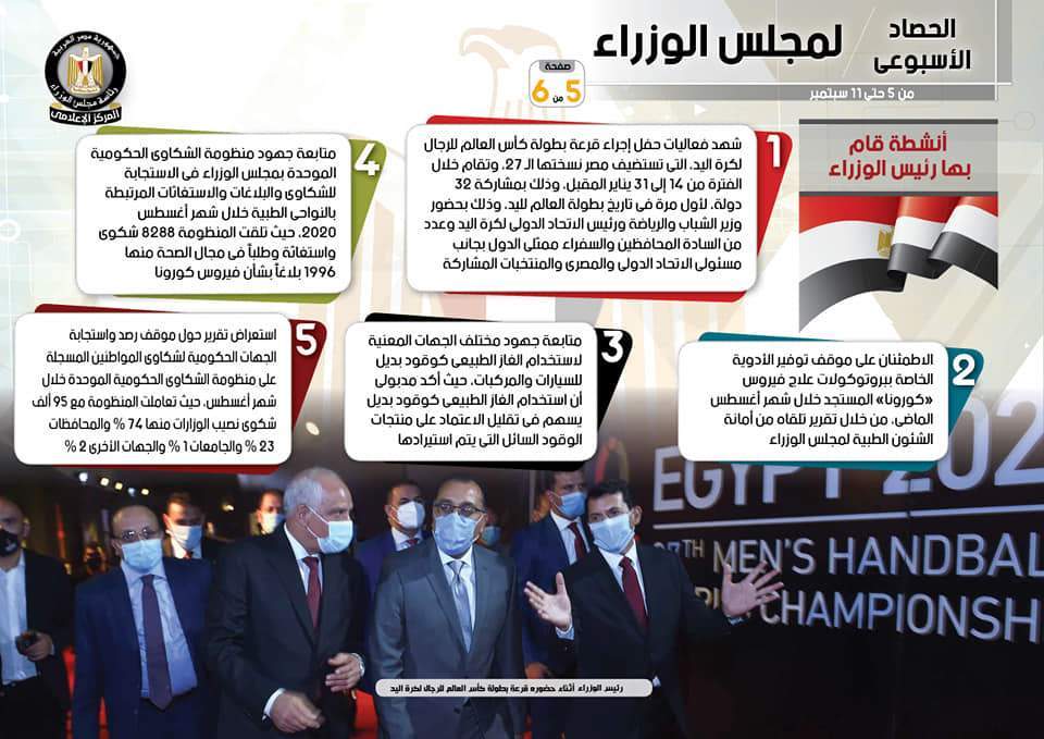 وبشأن الأنشطة التي قام بها رئيس الوزراء، فبحسب التقرير، تلقي مدبولي تقرير من أمانة الشئون الطبية لمجلس الوزراء بشأن الاطمئنان على موقف توفير الأدوية الخاصة ببروتوكولات علاج فيروس "كورونا" المستجد خلال شهر أغسطس الماضي، بجانب حضور فعاليات حفل إجراء قرعة بطولة كأس العالم للرجال لكرة اليد، التي تستضيف مصر في نسختها الـ 27، وتقام خلال الفترة من 14 إلى 31 يناير المقبل، وذلك بمشاركة 32 دولة، لأول مرة في تاريخ بطولة العالم لليد، وذلك بحضور وزير الشباب والرياضة ورئيس الاتحاد الدولي لكرة اليد وعدد من السادة المحافظين والسفراء ممثلي الدول بجانب مسئولي الاتحاد الدولي والمصري والمنتخبات المشاركة، فضلاً عن متابعة جهود منظومة الشكاوى الحكومية الموحدة بمجلس الوزراء في الاستجابة للشكاوى والبلاغات والاستغاثات المرتبطة بالنواحي الطبية خلال شهر أغسطس 2020، حيث تلقت المنظومة 8288 شكوى واستغاثة وطلباً في مجال الصحة منها 1996 بلاغاً بشأن فيروس كورونا، وكذلك متابعة جهود مختلف الجهات المعنية لاستخدام الغاز الطبيعي كوقود بديل للسيارات والمركبات، وتأكيد سيادته على أن استخدام الغاز الطبيعي كوقود بديل يسهم في تقليل الاعتماد على منتجات الوقود السائل التي يتم استيرادها.