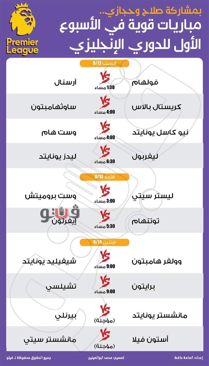 بمشاركة صلاح وحجازي.. مباريات قوية في الأسبوع الأول للدوري الإنجليزي | إنفو جراف السبت 12/سبتمبر/2020 - 12:17 ص 9/12/2020 12:17:12 AM بمشاركة صلاح وحجازي.. مباريات قوية في الأسبوع الأول للدوري شارك طباعة 18 حجم الخط شارك طباعة محمد صلاح الدوري الانجليزي أحمد حجازي