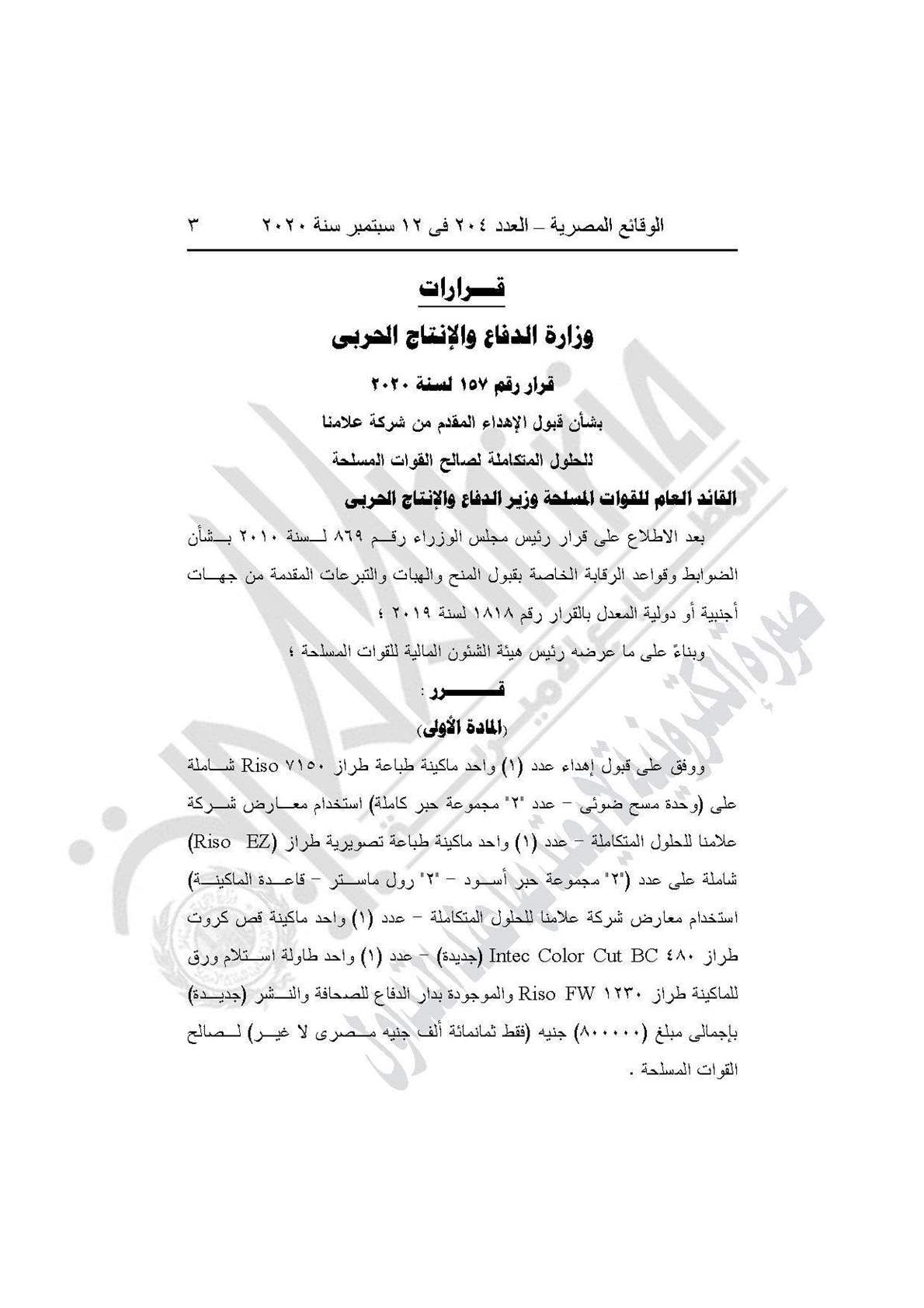 وينص القرار على قبول إهداء واحد ماكينة طباعة طراز 7150 Riso شاملة على (وحدة مسح ضوئي و2 مجموعة حبر كاملة) استخدام معارض شركة علامنا للحلول الكتكاملة، وماكينة طباعة تصوير طراز (Riso Ez)، وماكنة قص كروت طراز Intec Color Cut BC جديدة، وطاولة استلام ورق للماكينة طراز 1230 Riso FW، الموجودة بدار الدفاع للصحافة والنشر جديدة، بإجمالي 800 ألف جنيه لصالح القوات المسلحة.