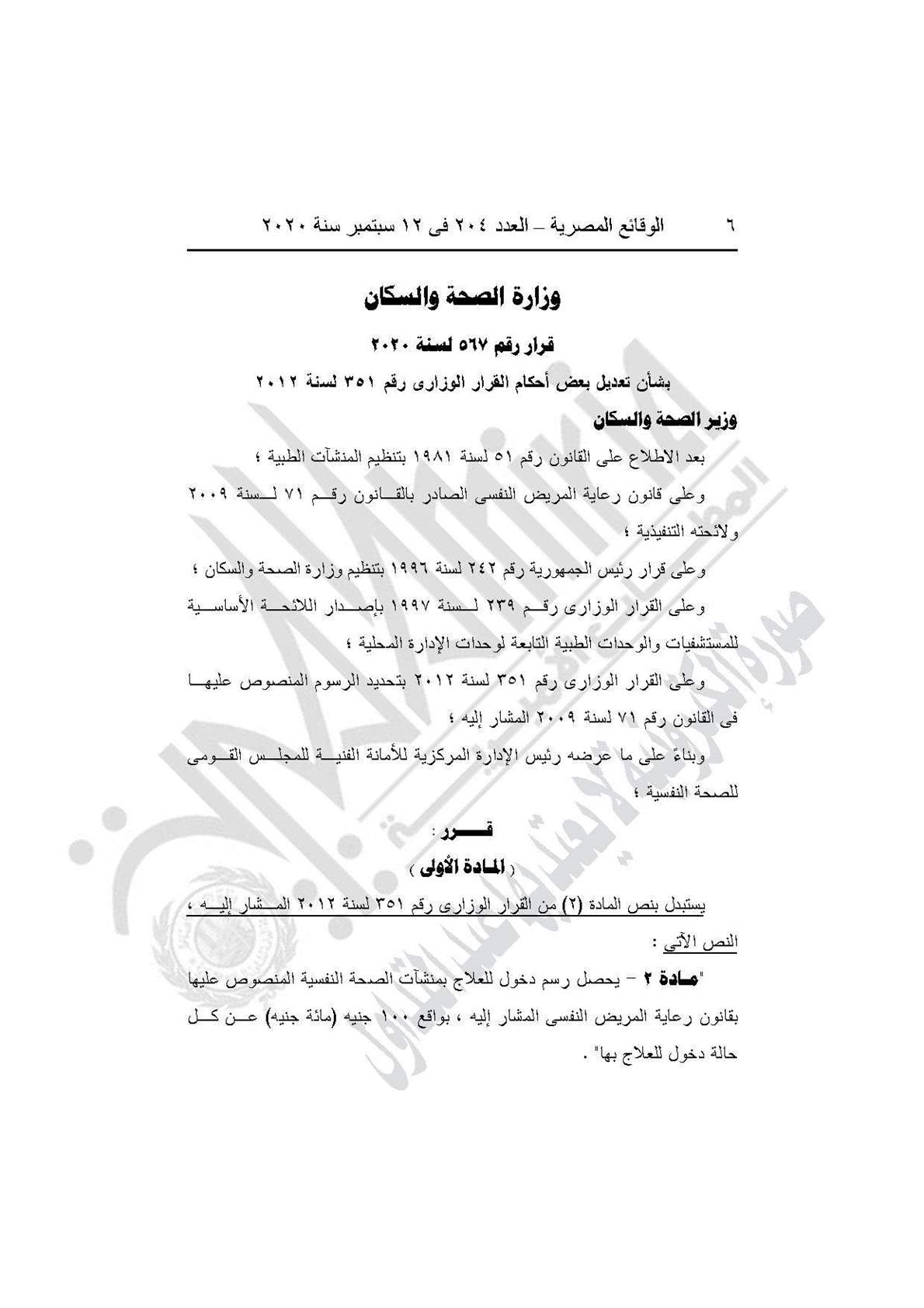 وينص القرار على استبدال المادة 2 من القرار رقم 351 لسنة 2012، وجاء فيه "يحصل رسم دخول للعلاج بمنشآت الصحة النفسية المنصوص عليها بقانون رعاية المريض النفسي المشار إليه، بواقع 100 جنيه عن كل حالة دخول للعلاج بها".