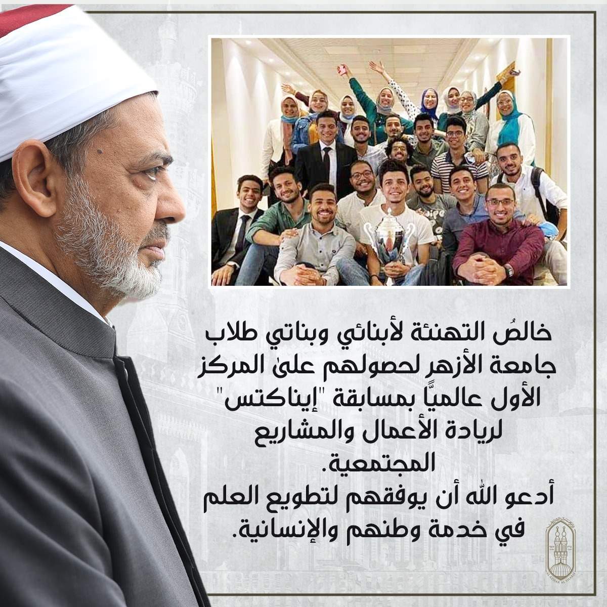 جاء ذلك خلال تدوينة لفضيلته على موقعي التواصل الاجتماعي فيسبوك وتويتر قال فيها "خالصُ التهنئة لأبنائي وبناتي طلاب جامعة الأزهر لحصولهم على المركز الأول عالميًّا بمسابقة "إيناكتس" لريادة الأعمال والمشاريع المجتمعية، أدعو الله أن يوفقهم لتطويع العلم في خدمة وطنهم والإنسانية".