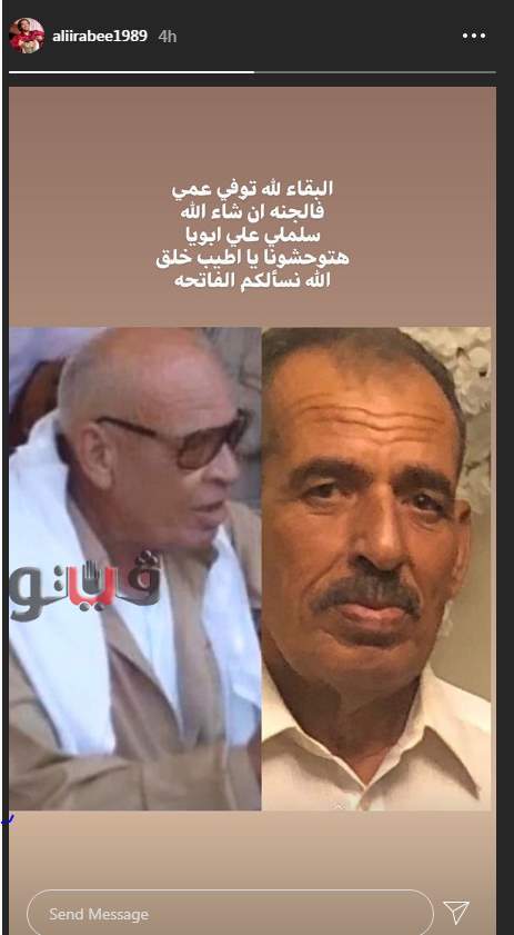 أعلن الفنان علي ربيع وفاة عمه عبر صفحته الشخصية على موقع الصور الشهير "إنستجرام" ونشر استوري لصورة عمه ووالده وكتب عليها تعليقاً «البقاء لله توفي عمي في الجنة إن شاء الله.. سلملي على أبويا.. هتوحشنا يا أطيب خلق الله».