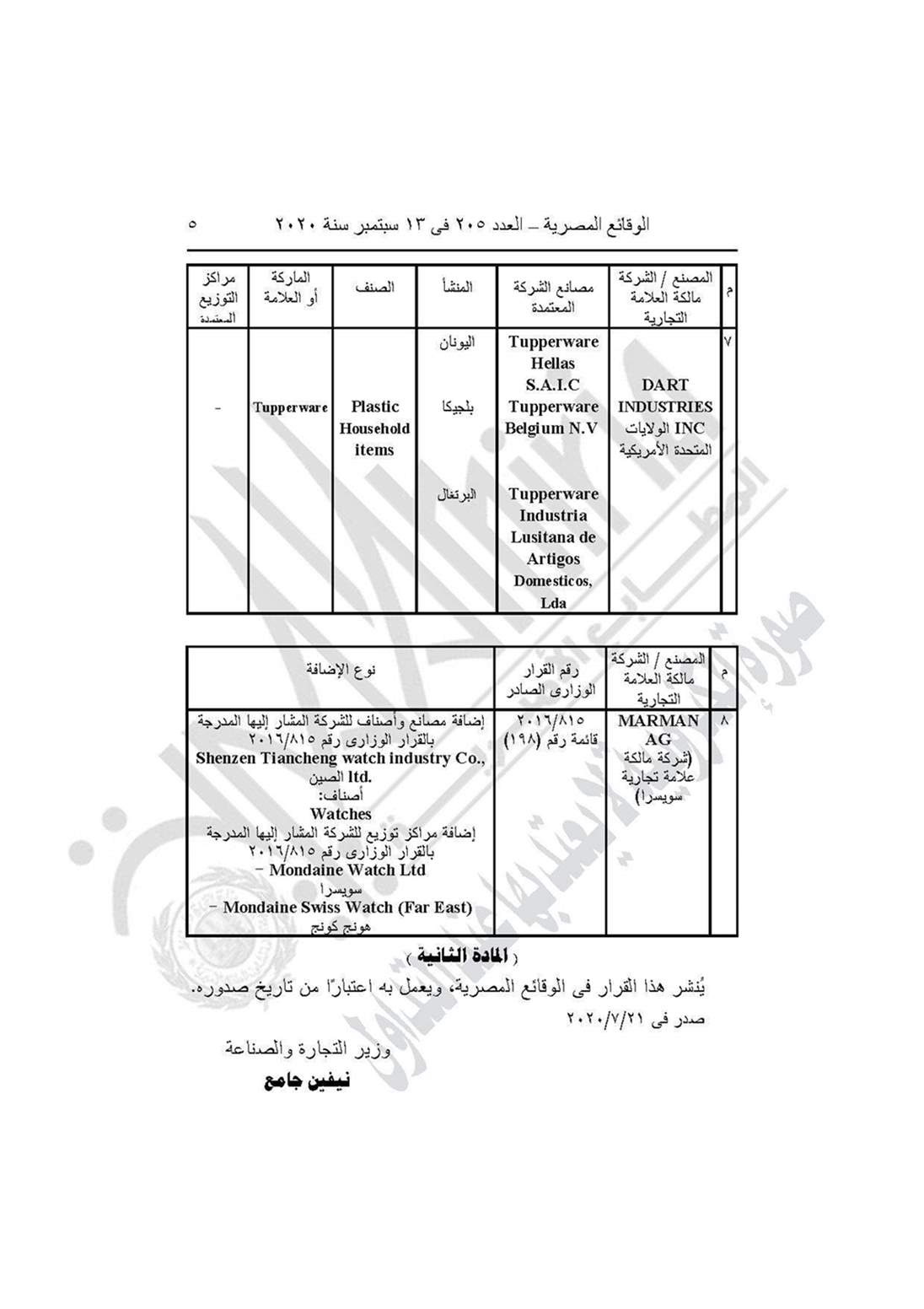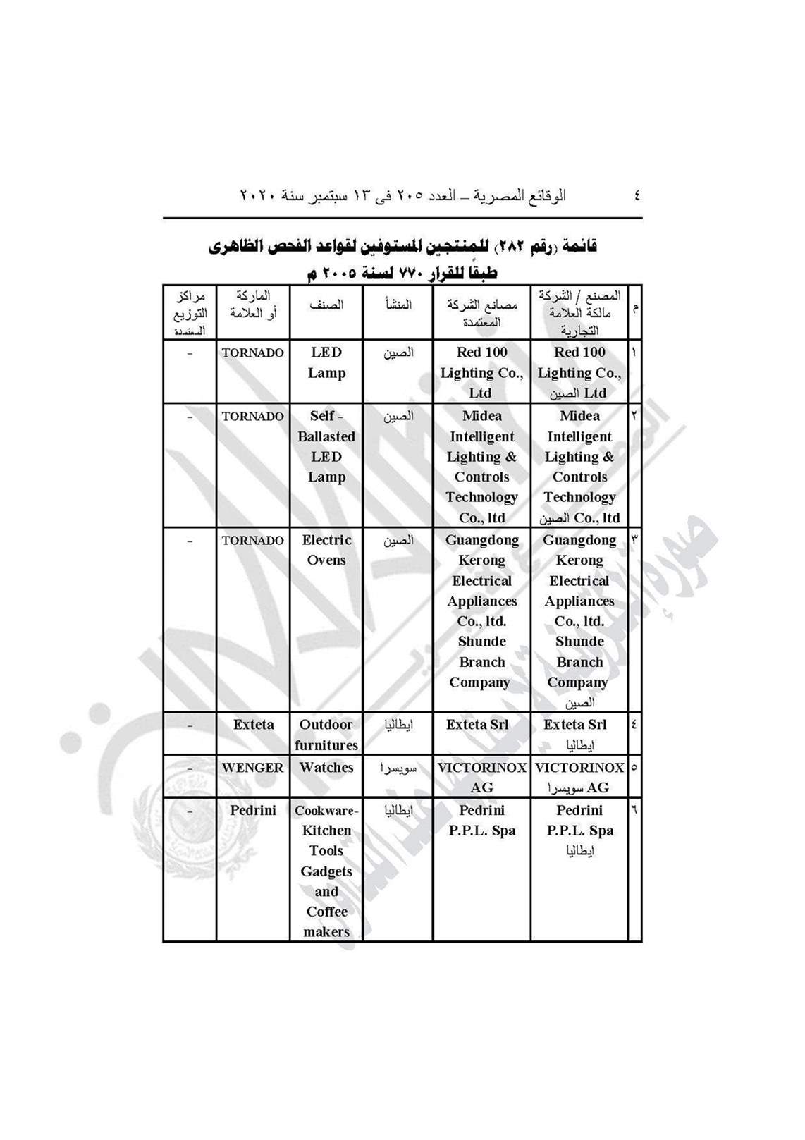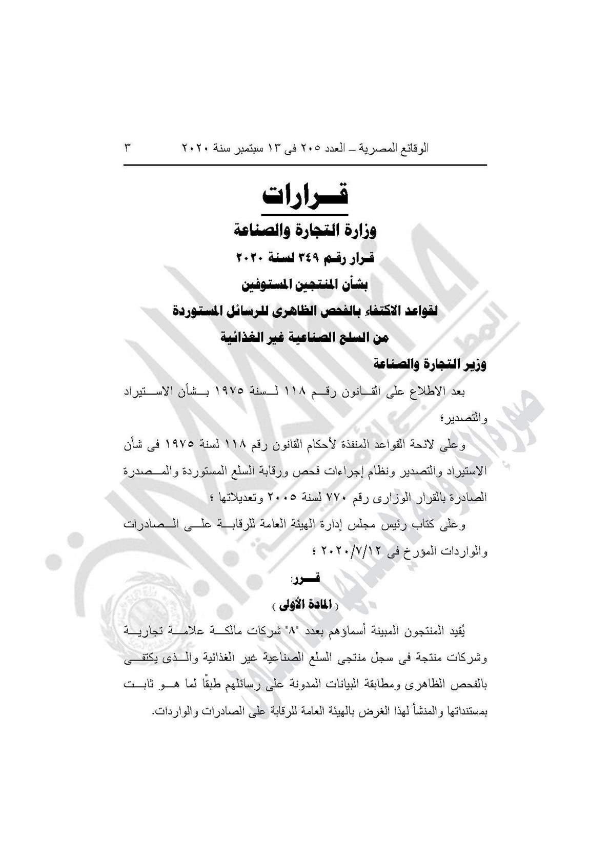 نشرت جريدة الوقائع المصرية في عددها رقم 205، الصادر في 13 سبتمبر 2020، قرار وزارة التجارة والصناعة رقم 349 لسنة 2020، بشأن المنتجين المستوفين لقواعد الاكتفاء بالفحص الظاهري للرسائل المستوردة من السلع الصناعية غير الغذائية.