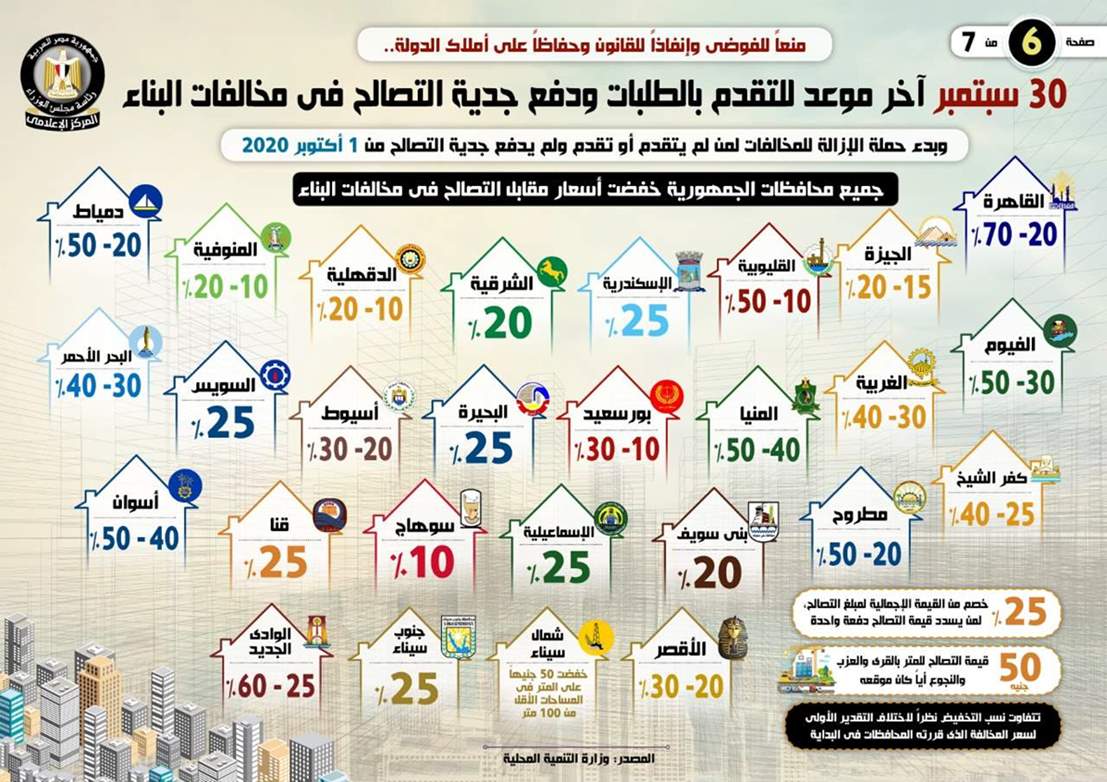 والمنوفية تراوحت ما بين 10 و20٪، والغربية تراوحت النسبة ما بين 30 و40٪، وكفر الشيخ ما بين 25 و40٪، وفي دمياط ما بين 20 و50%، والدقهلية ما بين 10 و20٪، وشمال سيناء خفضت 50 جنيهاً على المتر في المساحات الأقل من 100 متر، وجنوب سيناء 25٪، وبورسعيد ما بين 10 و30٪ والإسماعيلية 25٪، والسويس 25٪، والشرقية 20٪، والمنيا تراوحت النسبة ما بين 40 و50٪، والفيوم ما بين 30 و50٪، وأسيوط ما بين 20 و30٪، وسوهاج 10٪، وقنا وصلت النسبة إلى 25٪، وأسوان ما بين 40 و50٪، والبحر الأحمر ما بين 30 و40٪، والأقصر ما بين 20 و30٪، والجيزة ما بين 15 و20٪، ومطروح ما بين 20 و50٪، وبني سويف 20٪، والوادي الجديد ما بين 25 و60%، هذا وتتفاوت نسب التخفيض نظراً لاختلاف التقدير الأولي لسعر المخالفة الذي قررته المحافظات في البداية.