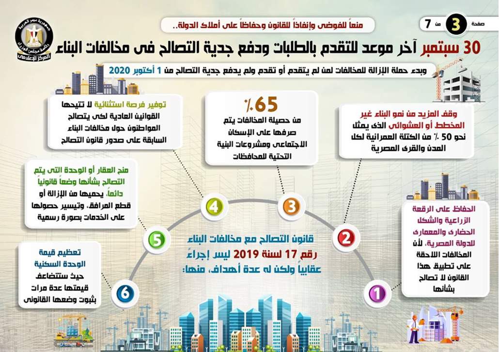 ونشر المركز الإعلامي لمجلس الوزراء، تقريراً شمل إنفوجرافات تسلط الضوء على مدى حرص الدولة على إنفاذ القانون ومنع الفوضى والحفاظ على أملاكها، خاصة وأن آخر موعد للتقدم ودفع جدية التصالح في مخالفات البناء هو 30 سبتمبر الجاري، وذلك قبل بدء حملة الإزالة للمخالفات لمن لم يتقدم أو تقدم ولم يدفع جدية التصالح من 1 أكتوبر 2020.