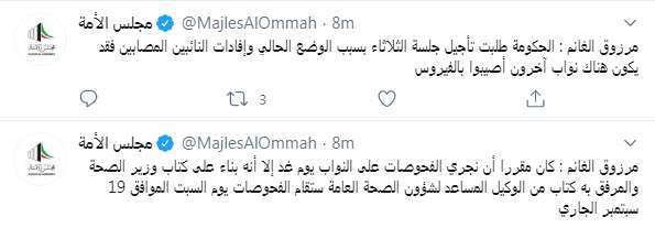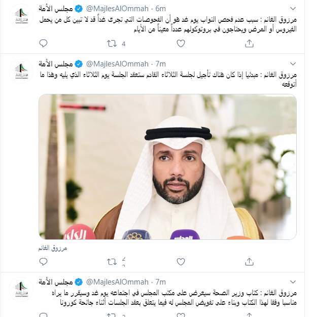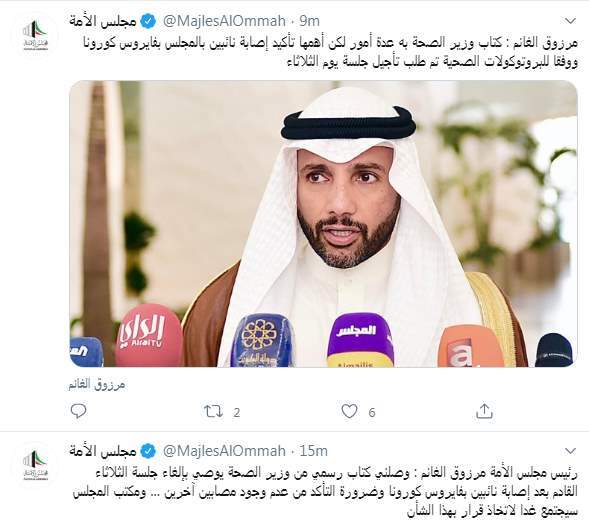 وكتب مجلس الأمة الكويتي على لسان رئيسه مرزوق الغانم تغريدة قال فيها: «وصلني كتاب رسمي من وزير الصحة يوصي بإلغاء جلسة الثلاثاء القادم بعد إصابة نائبين بفيروس كورونا وضرورة التأكد من عدم وجود مصابين آخرين.. ومكتب المجلس سيجتمع غدا لاتخاذ قرار بهذا الشأن».