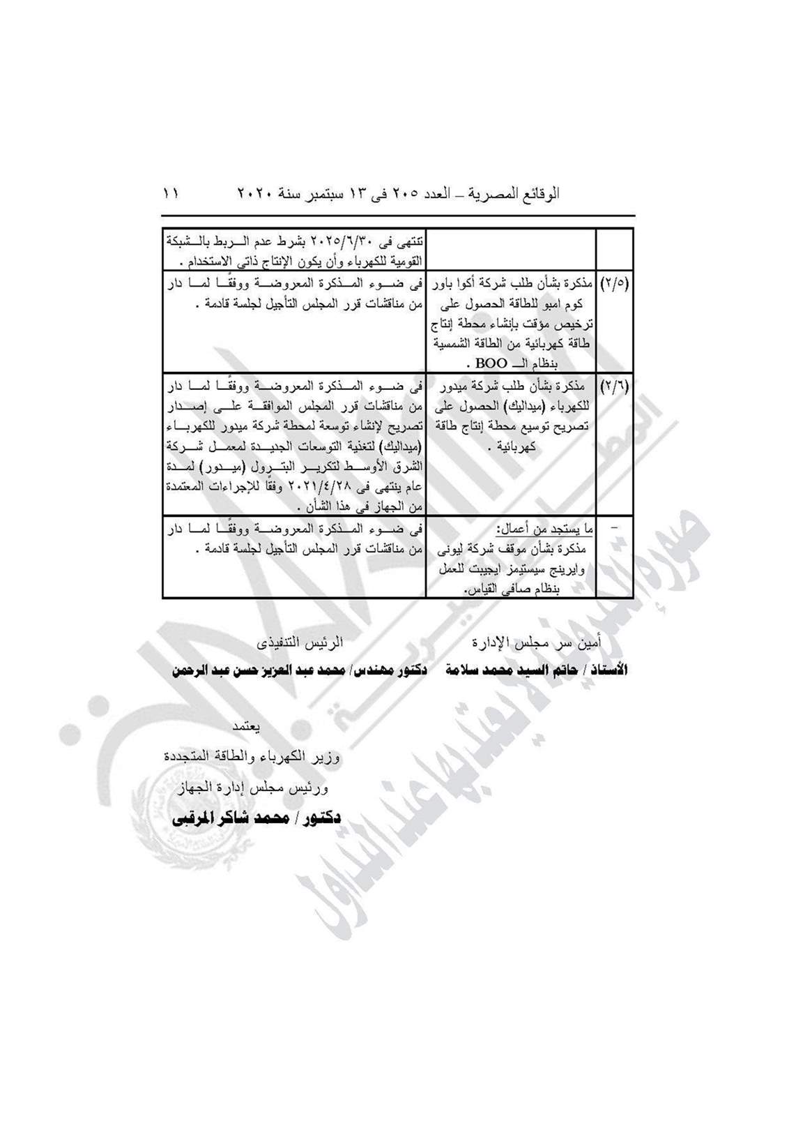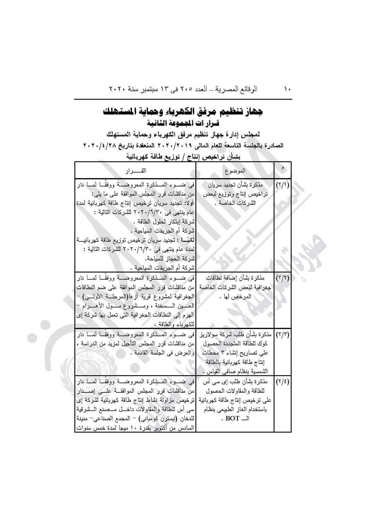نشرت جريدة الوقائع المصرية في عددها رقم 205، الصادر في 13 سبتمبر 2020، قرارات المجموعة الثانية لجهاز تنظيم مرفق الكهرباء وحماية المستهلك، في جلسته التاسعة للعام المالي 2019/2020، بشأن تراخيص إنتاج وتوزيع طاقة كهربائية.