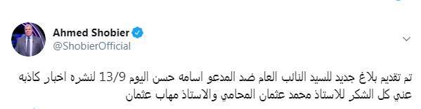 وكتب أحمد شوبير تغريدة على تويتر " تم تقديم بلاغ جديد للسيد النائب العام ضد المدعو أسامة حسن اليوم 13/9 لنشره أخبار كاذبة عني كل الشكر للأستاذ محمد عثمان المحامي والأستاذ مهاب عثمان"