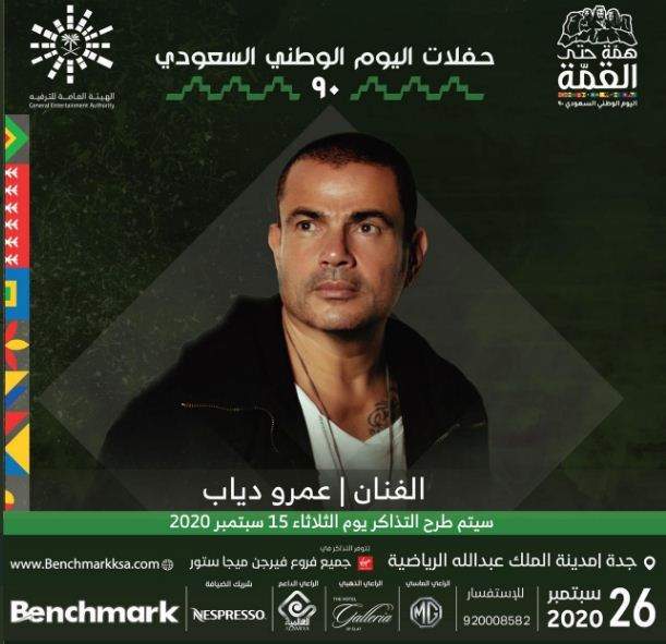 عمرو دياب يوم السبت الموافق 26 سبتمبر الجاري، حفلا غنائيا ضمن برنامج احتفالات اليوم الوطني 90 بالمملكة العربية السعودية.