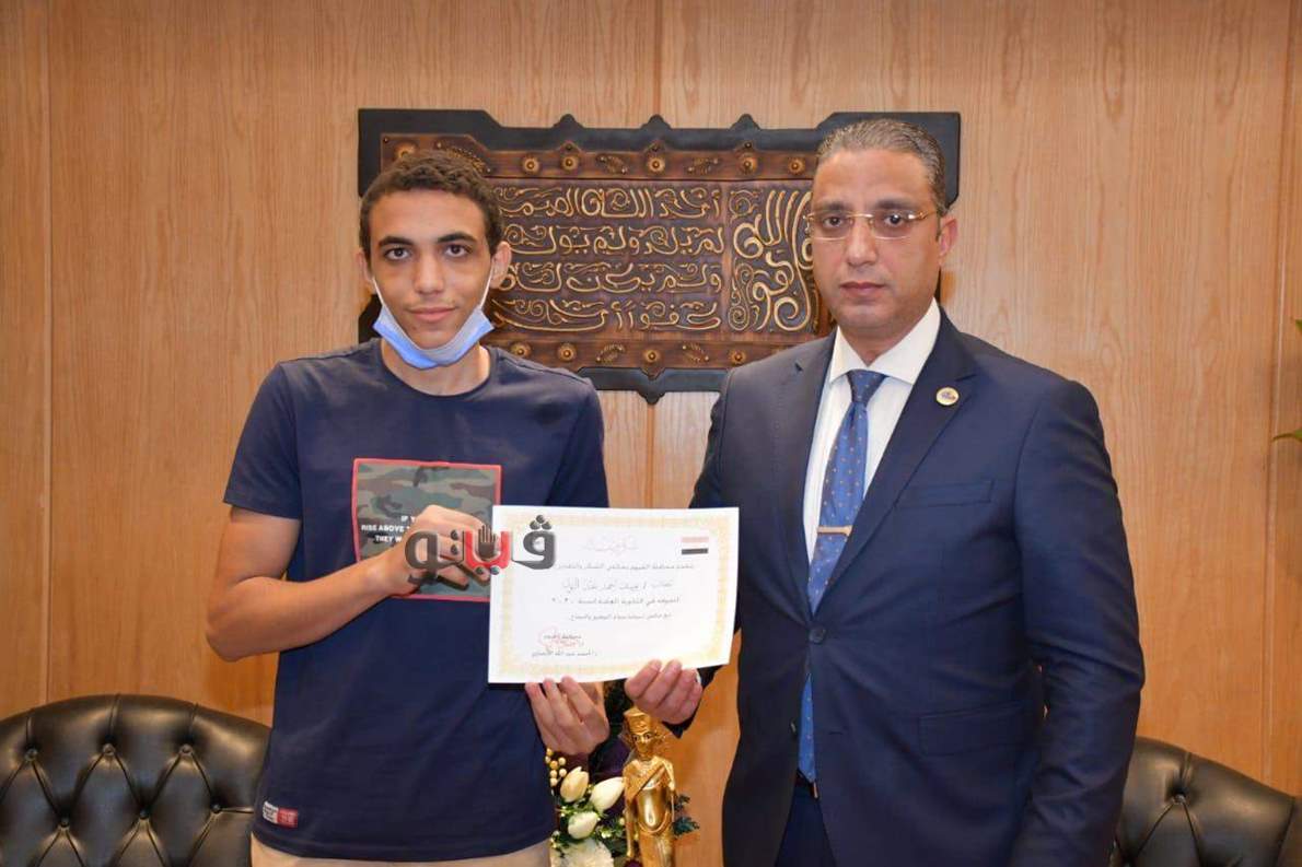 وكشف "التوني" أن المحافظ منح الطالب شهادة تقدير ودرع المحافظة، تقديراً لتفوقه الدراسى في الثانوية العامة، فضلاً عن كونه نموذج من الشباب المكافح الذين يجب الاقتداء بهم، كما استمع المحافظ لأمنية الطالب الذي يرغب فى الحصول على منحة دراسية، وتواصل المحافظ هاتفياً مع الدكتور خالد عبدالغفار وزير التعليم العالي والبحث العلمي، لتوفير منحة دراسية له.