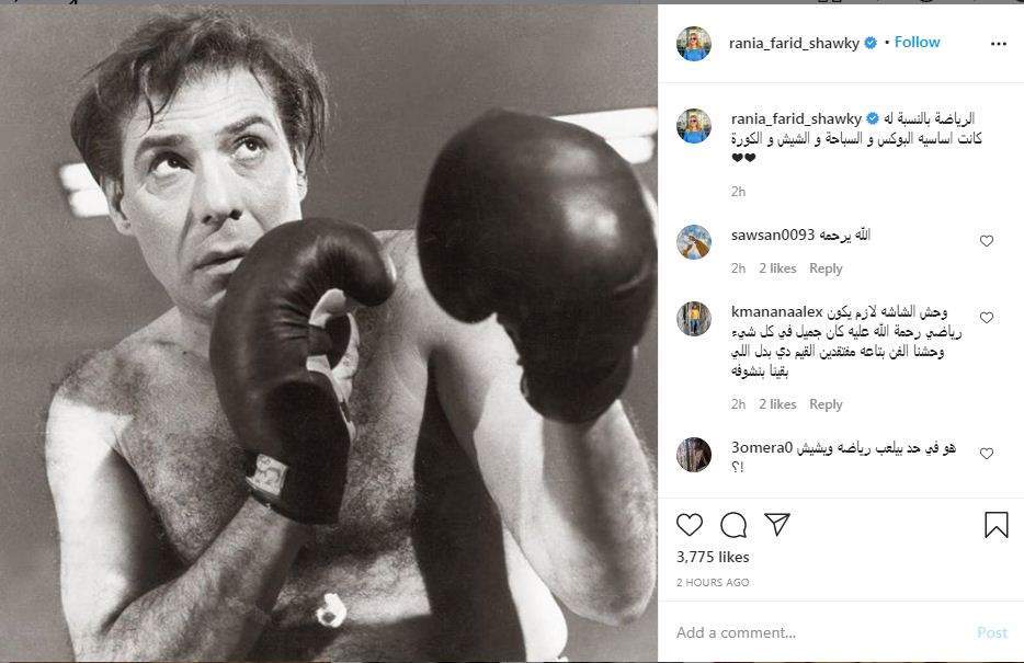 نشرت الفنانة رانيا فريد شوقي عبر حسابها الشخصي على موقع الصور الشهير "انستجرام"، صورة نادرة لوالدها النجم الراحل فريد شوقي أثناء ممارسة رياضة "البوكس".