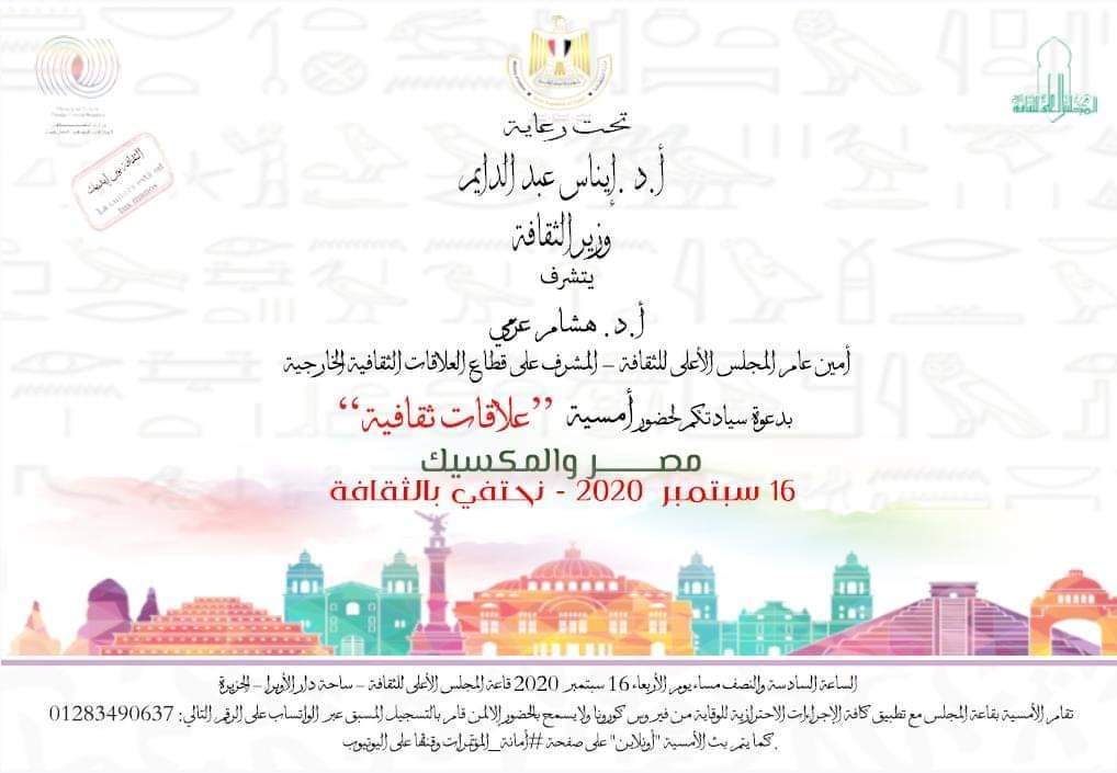 ينظم قطاع العلاقات الثقافية الخارجية ، بالتعاون مع المجلس الأعلى للثقافة، يوم الأربعاء المقبل الموافق 16 سبتمبر الحالي، في تمام السادسة والنصف مساءً ، أمسية ثقافية بعنوان " مصر المكسيك - علاقات ثقافية".
